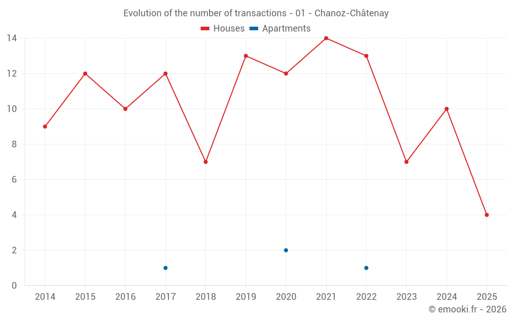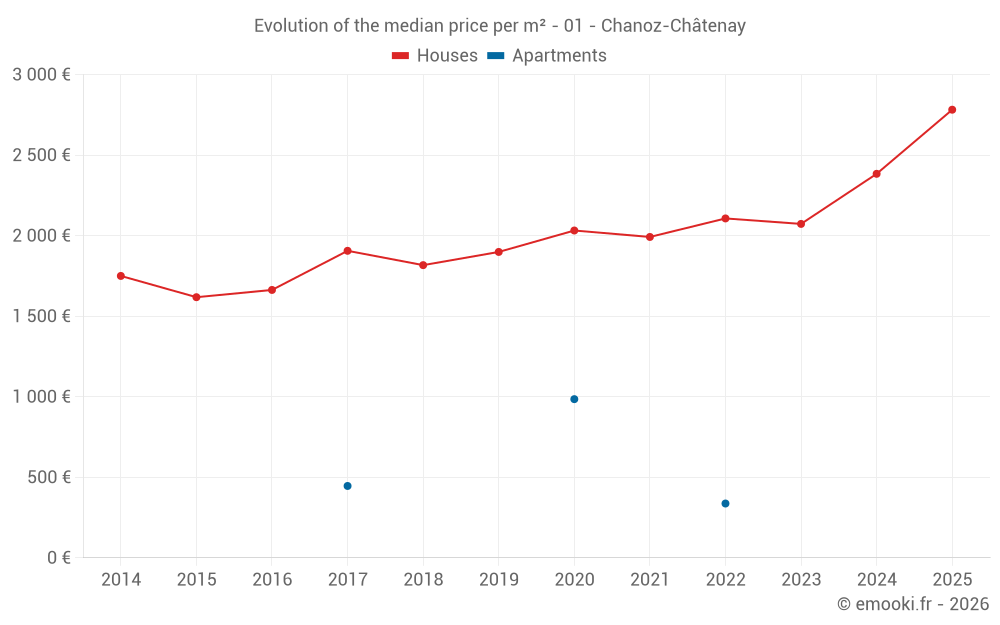 The median price on the 18 house transactions of the last 24 months in the municipality of Chanoz-Châtenay was 2 390 € per square meter for a median property value of 265 000 €. Over this period, 60% of transactions were between 2 085 and 2 759 € per square meter (from the 2nd to the 8th deciles).