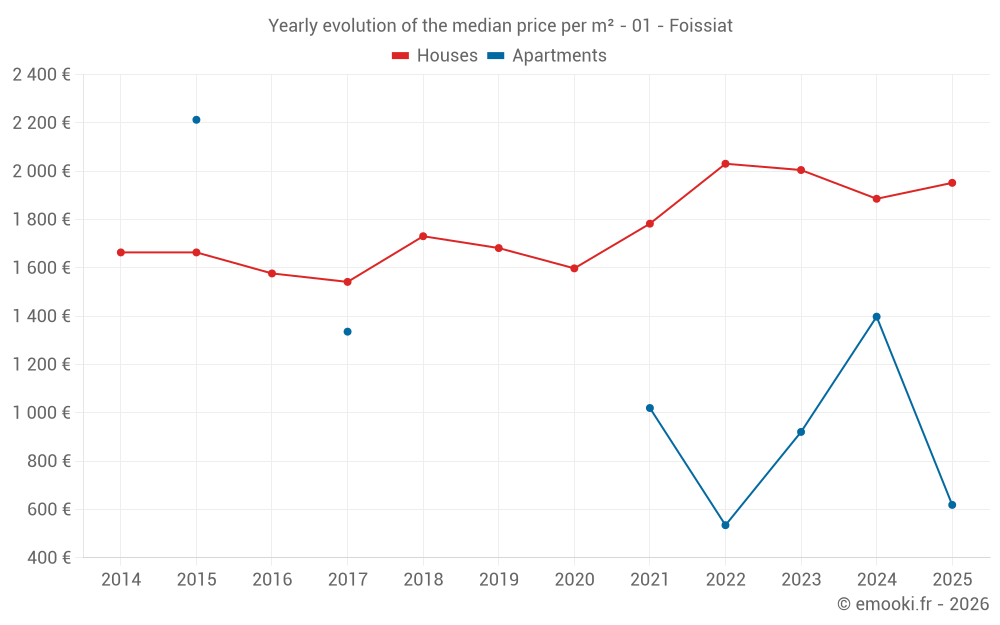 The median price on the 26 house transactions of the last 12 months in the municipality of Foissiat was 1 960 € per square meter for a median property value of 202 000 €. Over this period, 60% of transactions were between 1 138 and 2 417 € per square meter (from the 2nd to the 8th deciles).