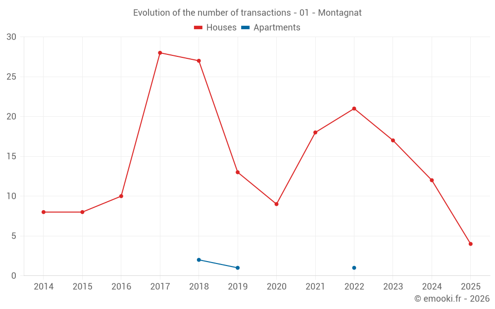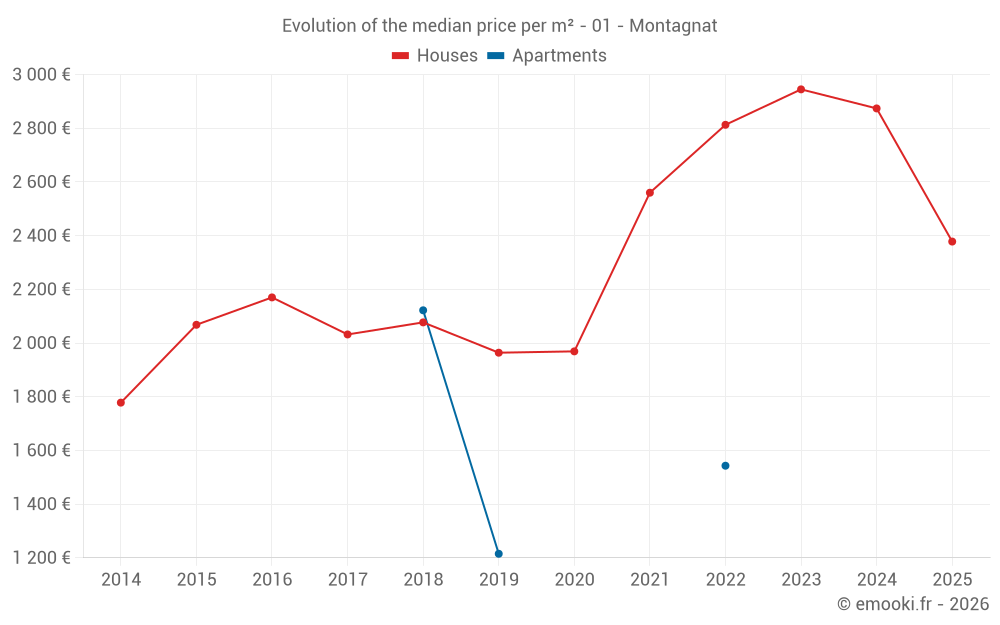 The median price on the 24 house transactions of the last 24 months in the municipality of Montagnat was 2 803 € per square meter for a median property value of 290 000 €. Over this period, 60% of transactions were between 2 325 and 3 462 € per square meter (from the 2nd to the 8th deciles).