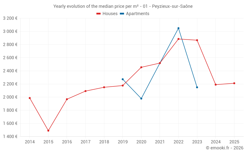 The median price on the 14 house transactions of the last 24 months in the municipality of Peyzieux-sur-Saône was 2 190 € per square meter for a median property value of 210 000 €. Over this period, 60% of transactions were between 1 156 and 2 684 € per square meter (from the 2nd to the 8th deciles).