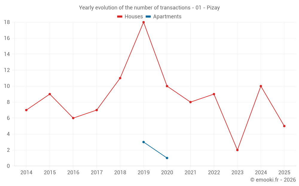 The median price on the 15 house transactions of the last 24 months in the municipality of Pizay was 2 409 € per square meter for a median property value of 265 000 €. Over this period, 60% of transactions were between 1 660 and 3 437 € per square meter (from the 2nd to the 8th deciles).
