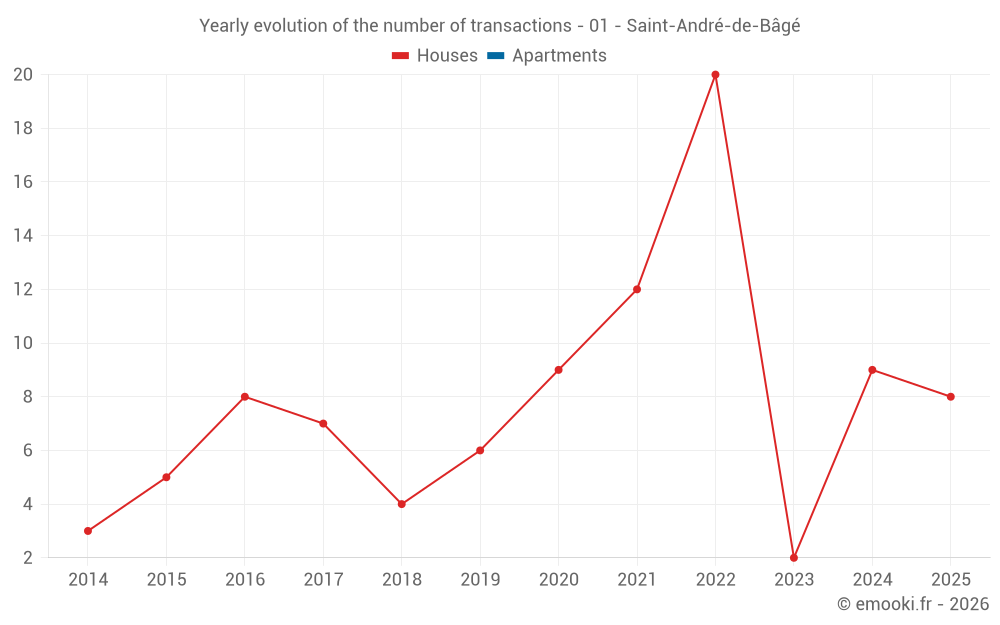The median price on the 18 house transactions of the last 24 months in the municipality of Saint-André-de-Bâgé was 2 562 € per square meter for a median property value of 281 500 €. Over this period, 60% of transactions were between 1 804 and 2 915 € per square meter (from the 2nd to the 8th deciles).