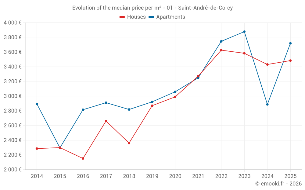 The median price on the 23 house transactions of the last 12 months in the municipality of Saint-André-de-Corcy was 3 431 € per square meter for a median property value of 371 500 €. Over this period, 60% of transactions were between 2 922 and 4 503 € per square meter (from the 2nd to the 8th deciles).