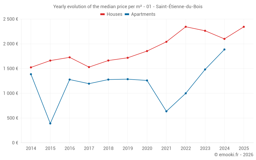 The median price on the 33 house transactions of the last 24 months in the municipality of Saint-Étienne-du-Bois was 2 238 € per square meter for a median property value of 199 000 €. Over this period, 60% of transactions were between 1 667 and 2 606 € per square meter (from the 2nd to the 8th deciles).