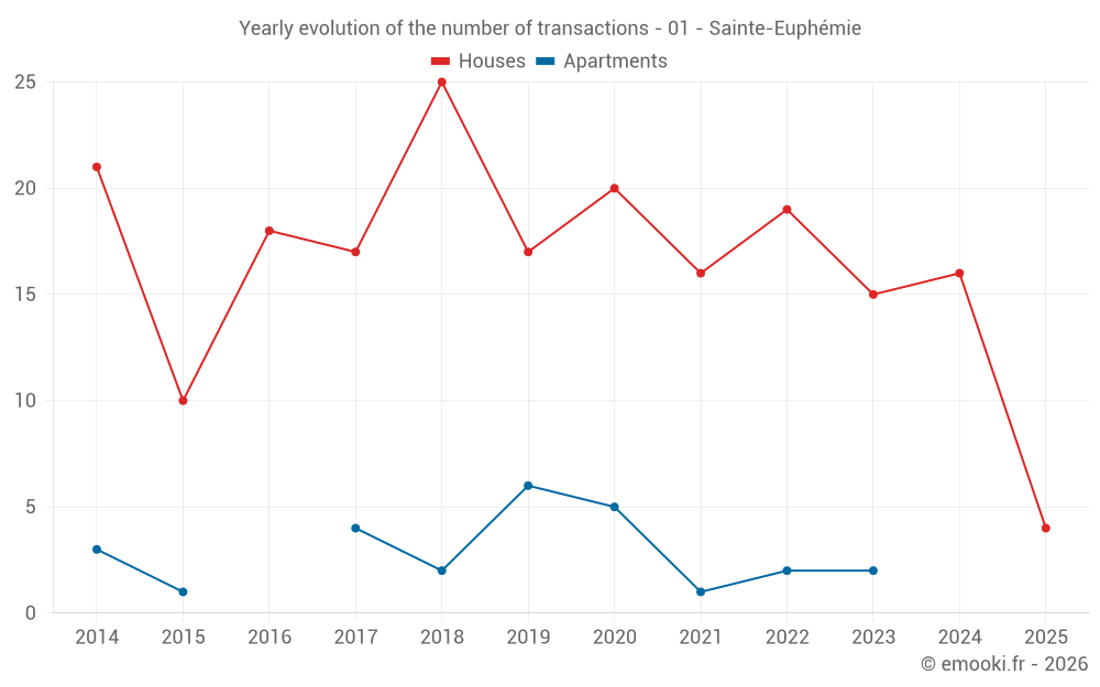 The median price on the 25 house transactions of the last 24 months in the municipality of Sainte-Euphémie was 3 288 € per square meter for a median property value of 323 400 €. Over this period, 60% of transactions were between 2 703 and 3 681 € per square meter (from the 2nd to the 8th deciles).