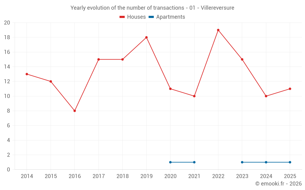 The median price on the 21 house transactions of the last 24 months in the municipality of Villereversure was 1 490 € per square meter for a median property value of 150 000 €. Over this period, 60% of transactions were between 1 071 and 2 158 € per square meter (from the 2nd to the 8th deciles).
