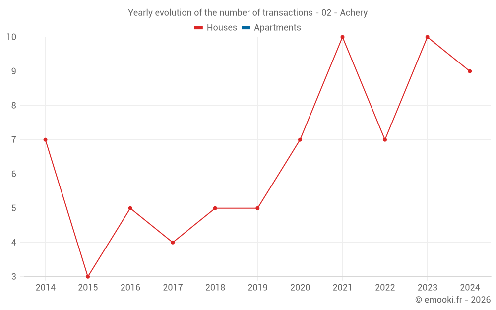 The median price on the 14 house transactions of the last 24 months in the municipality of Achery was 1 016 € per square meter for a median property value of 123 750 €. Over this period, 60% of transactions were between 706 and 1 508 € per square meter (from the 2nd to the 8th deciles).