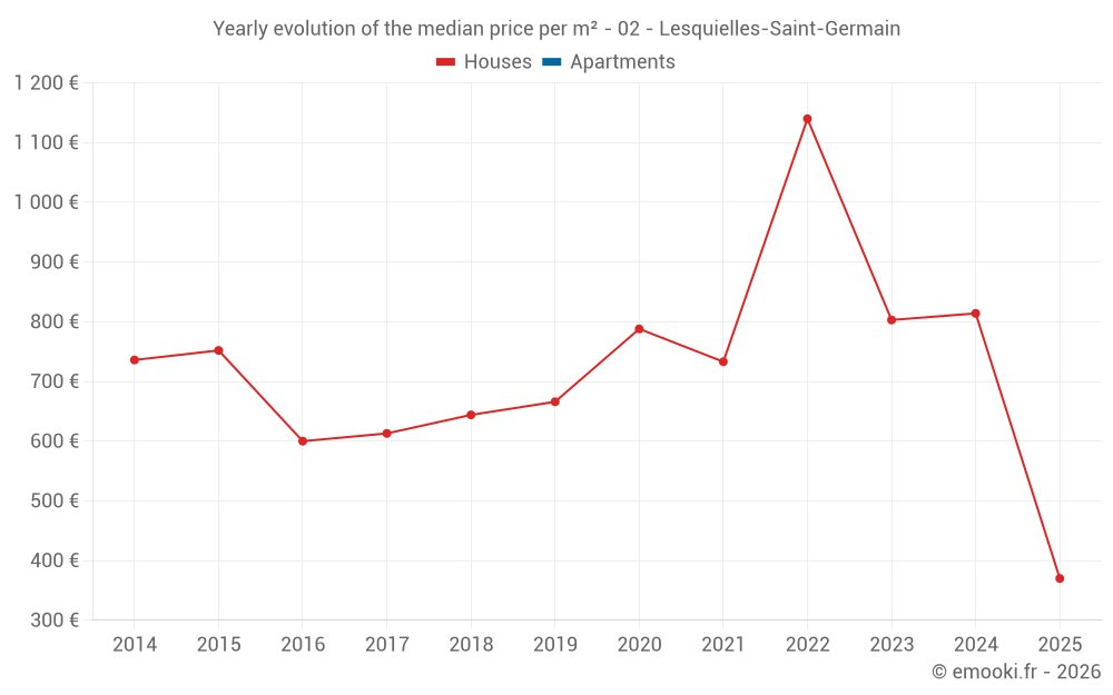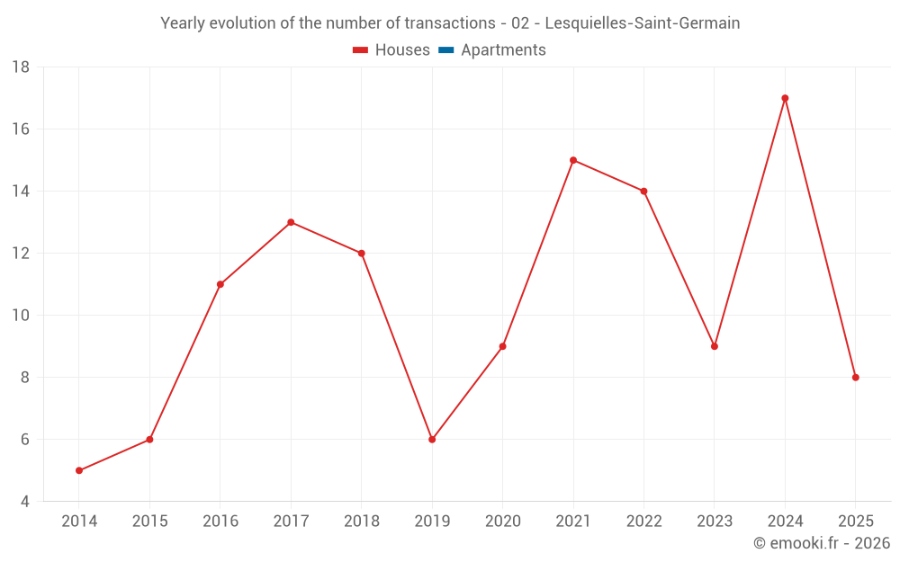 The median price on the 17 house transactions of the last 12 months in the municipality of Lesquielles-Saint-Germain was 677 € per square meter for a median property value of 62 000 €. Over this period, 60% of transactions were between 323 and 954 € per square meter (from the 2nd to the 8th deciles).