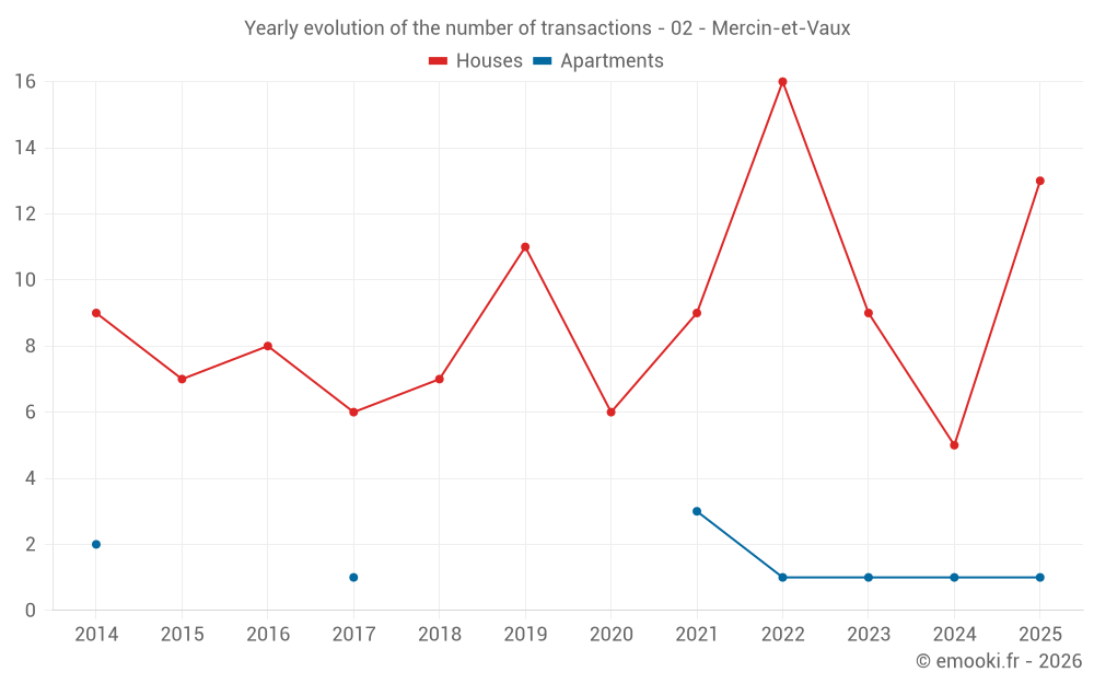 The median price on the 18 house transactions of the last 24 months in the municipality of Mercin-et-Vaux was 1 704 € per square meter for a median property value of 140 000 €. Over this period, 60% of transactions were between 1 432 and 1 977 € per square meter (from the 2nd to the 8th deciles).