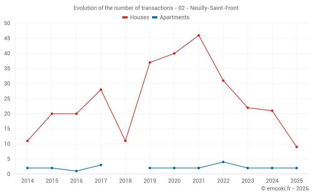 The median price on the 23 house transactions of the last 12 months in the municipality of Neuilly-Saint-Front was 1 214 € per square meter for a median property value of 140 000 €. Over this period, 60% of transactions were between 827 and 1 667 € per square meter (from the 2nd to the 8th deciles).