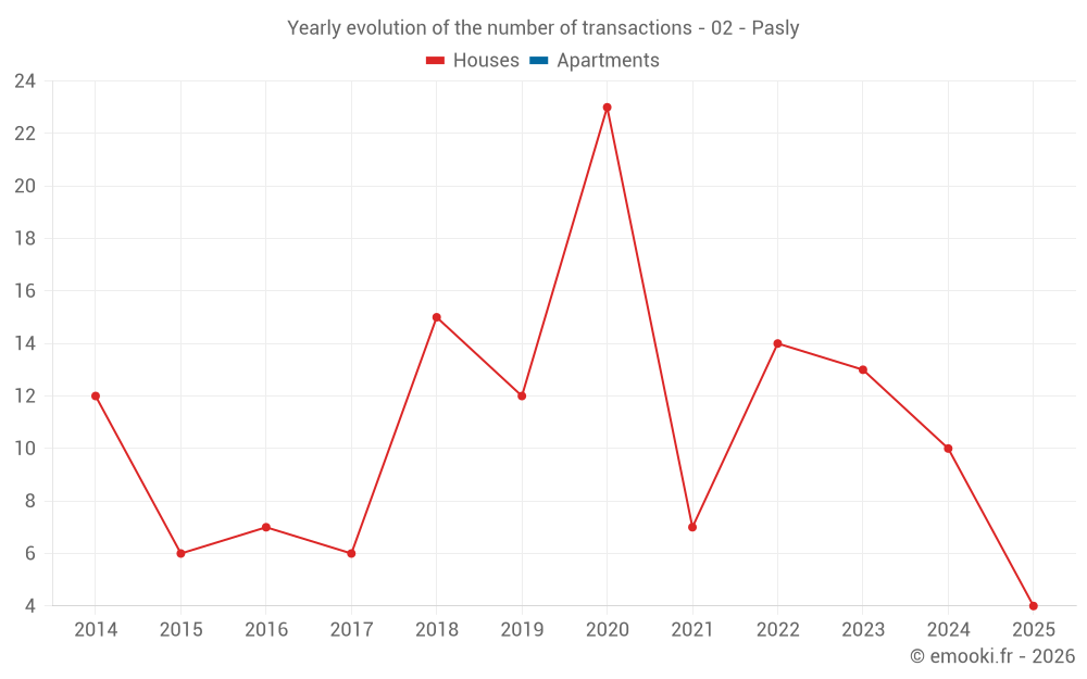 The median price on the 23 house transactions of the last 24 months in the municipality of Pasly was 1 796 € per square meter for a median property value of 178 000 €. Over this period, 60% of transactions were between 1 400 and 2 039 € per square meter (from the 2nd to the 8th deciles).