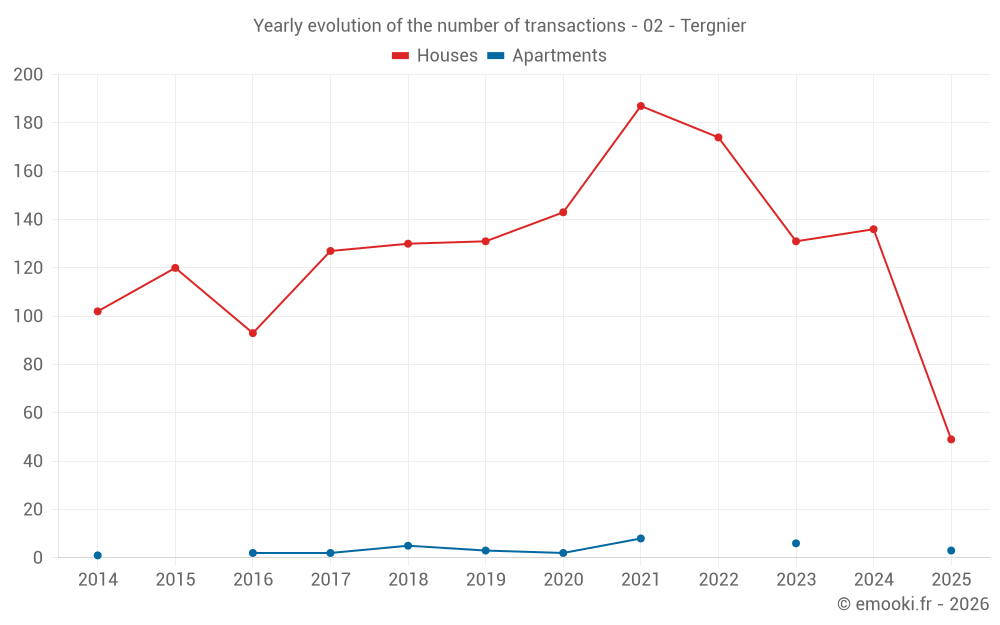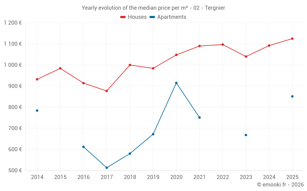 The median price on the 22 house transactions of the last 3 months in the municipality of Tergnier was 1 135 € per square meter for a median property value of 87 000 €. Over this period, 60% of transactions were between 990 and 1 564 € per square meter (from the 2nd to the 8th deciles).