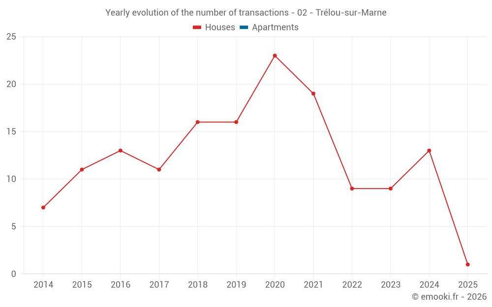 The median price on the 19 house transactions of the last 24 months in the municipality of Trélou-sur-Marne was 1 410 € per square meter for a median property value of 119 700 €. Over this period, 60% of transactions were between 756 and 1 698 € per square meter (from the 2nd to the 8th deciles).