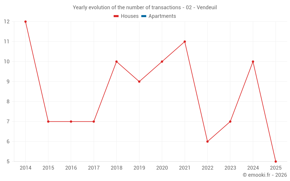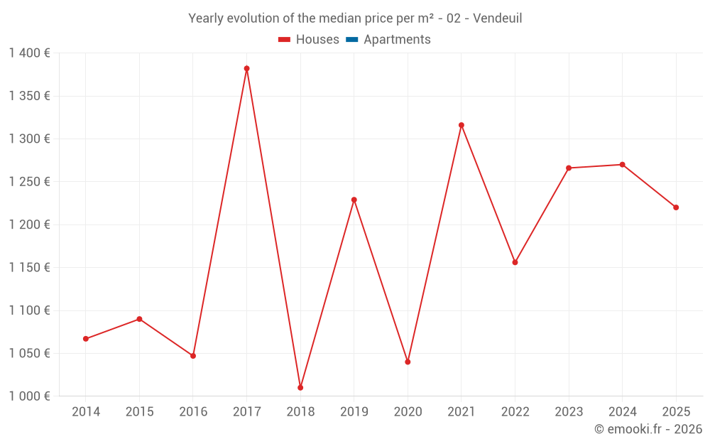 The median price on the 20 house transactions of the last 24 months in the municipality of Vendeuil was 1 262 € per square meter for a median property value of 89 950 €. Over this period, 60% of transactions were between 1 041 and 1 670 € per square meter (from the 2nd to the 8th deciles).