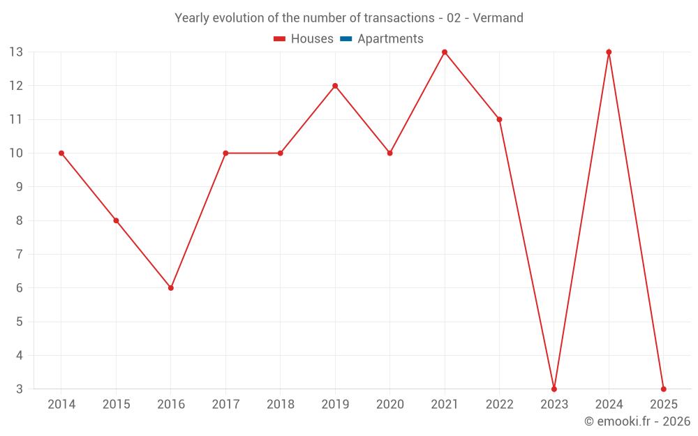 The median price on the 17 house transactions of the last 24 months in the municipality of Vermand was 1 143 € per square meter for a median property value of 87 000 €. Over this period, 60% of transactions were between 799 and 1 312 € per square meter (from the 2nd to the 8th deciles).