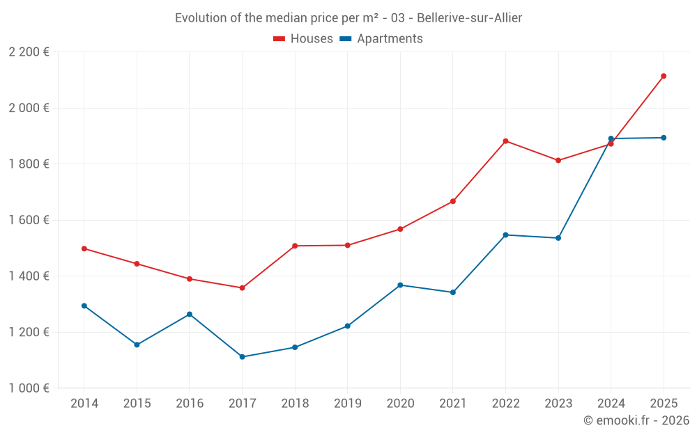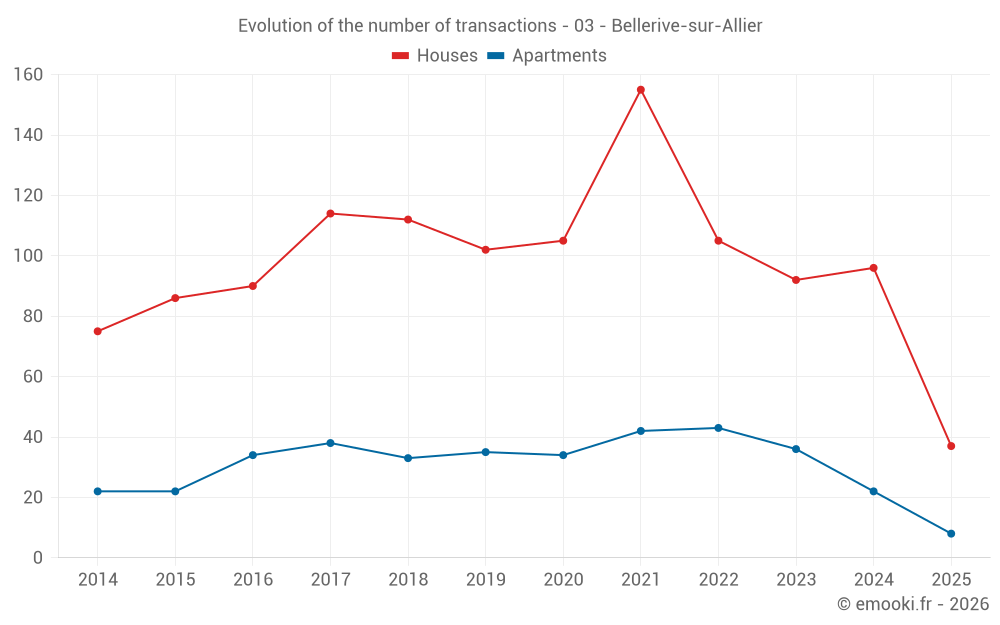 The median price on the 37 house transactions of the last 6 months in the municipality of Bellerive-sur-Allier was 2 114 € per square meter for a median property value of 233 950 €. Over this period, 60% of transactions were between 1 620 and 2 641 € per square meter (from the 2nd to the 8th deciles).