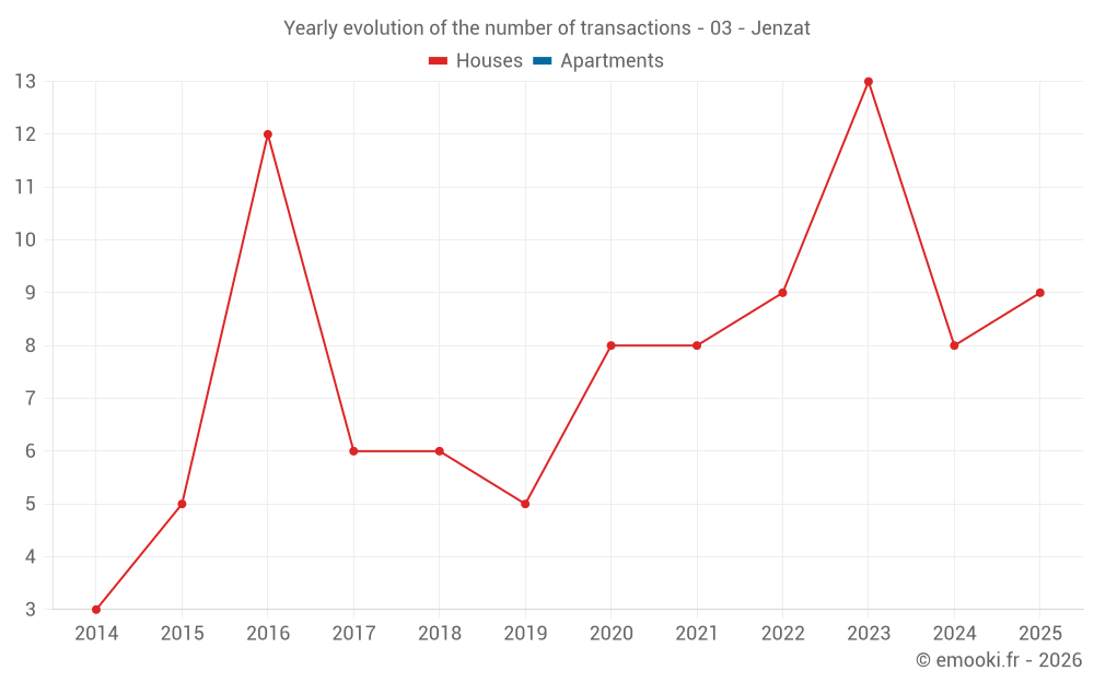 The median price on the 17 house transactions of the last 24 months in the municipality of Jenzat was 804 € per square meter for a median property value of 119 000 €. Over this period, 60% of transactions were between 577 and 1 487 € per square meter (from the 2nd to the 8th deciles).