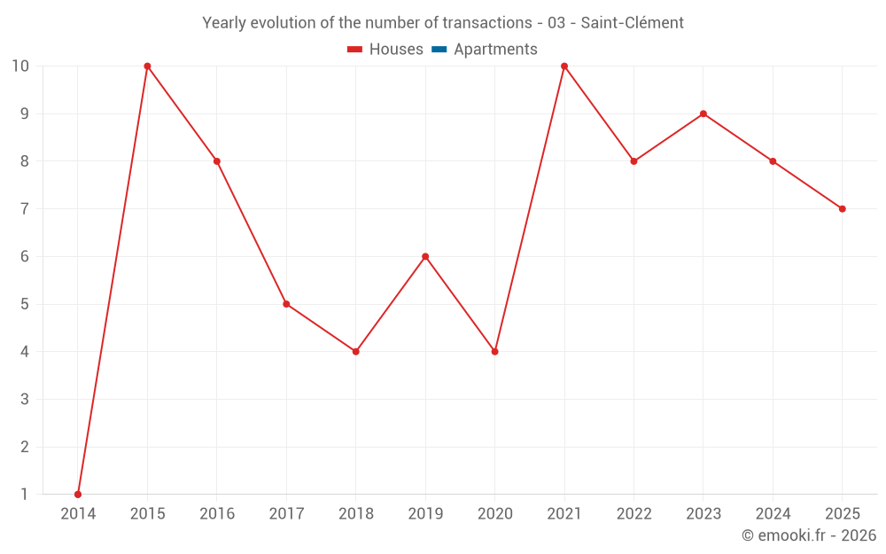 The median price on the 20 house transactions of the last 24 months in the municipality of Saint-Clément was 1 083 € per square meter for a median property value of 97 350 €. Over this period, 60% of transactions were between 673 and 1 678 € per square meter (from the 2nd to the 8th deciles).
