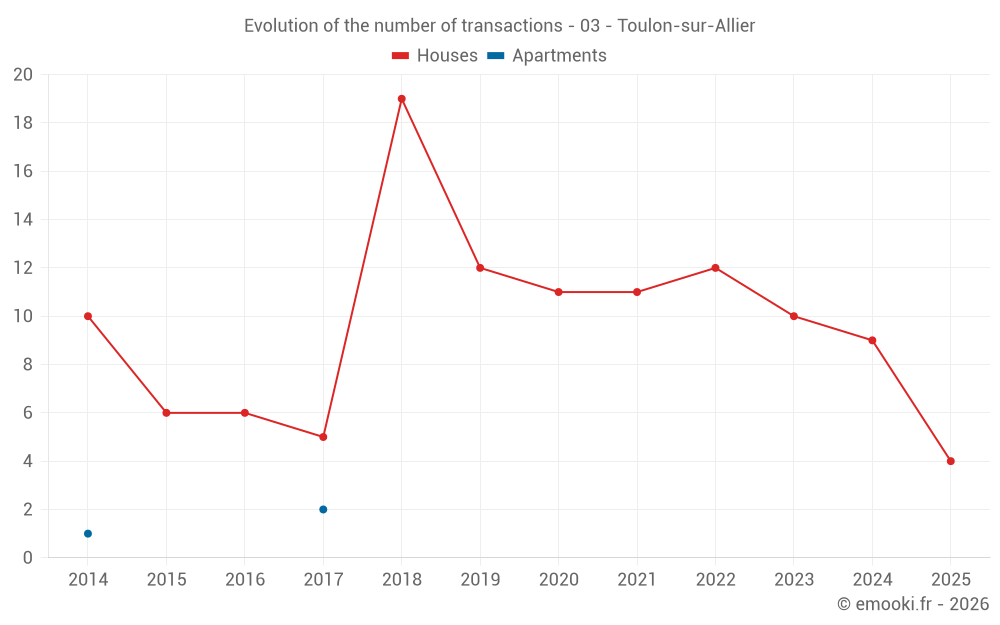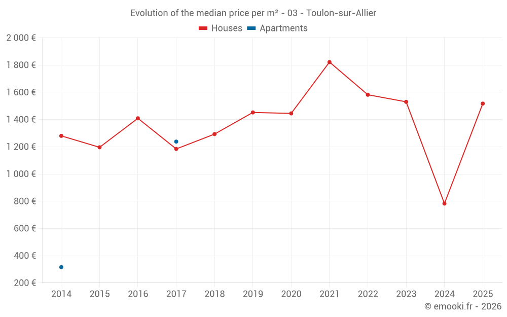 The median price on the 18 house transactions of the last 24 months in the municipality of Toulon-sur-Allier was 1 436 € per square meter for a median property value of 104 000 €. Over this period, 60% of transactions were between 592 and 1 893 € per square meter (from the 2nd to the 8th deciles).