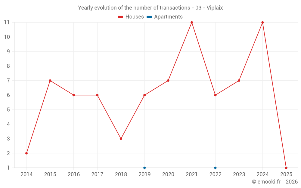 The median price on the 17 house transactions of the last 24 months in the municipality of Viplaix was 516 € per square meter for a median property value of 40 000 €. Over this period, 60% of transactions were between 241 and 764 € per square meter (from the 2nd to the 8th deciles).