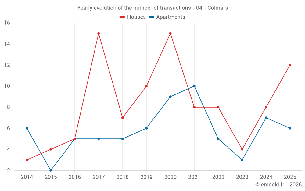 The median price on the 20 house transactions of the last 24 months in the municipality of Colmars was 2 680 € per square meter for a median property value of 207 500 €. Over this period, 60% of transactions were between 1 906 and 3 517 € per square meter (from the 2nd to the 8th deciles).