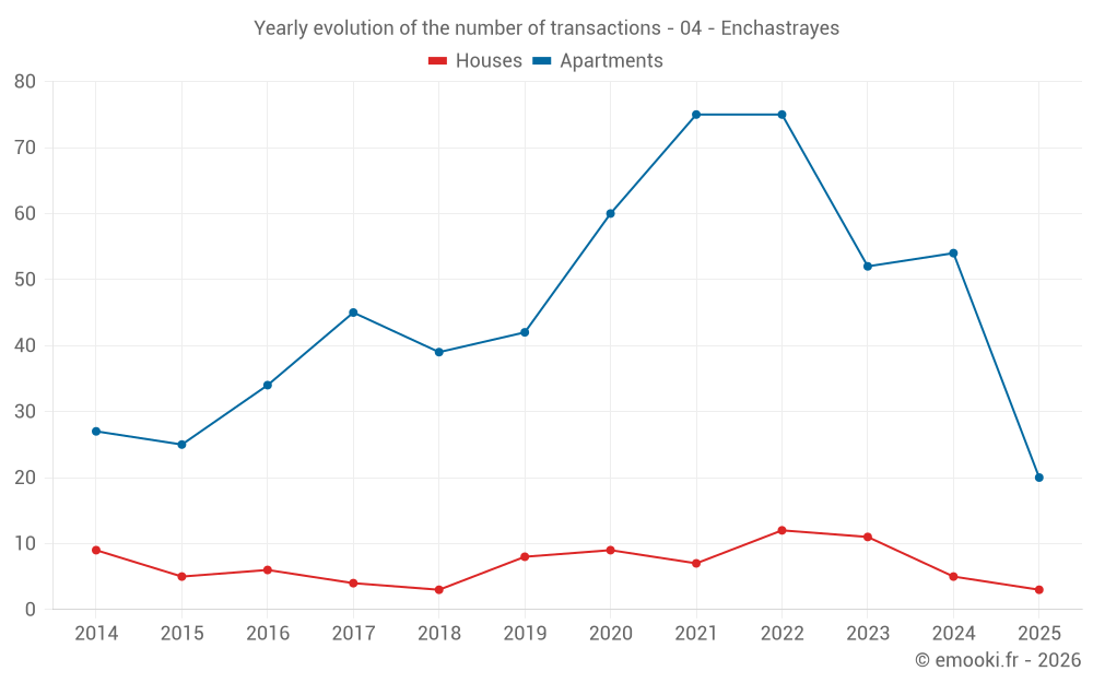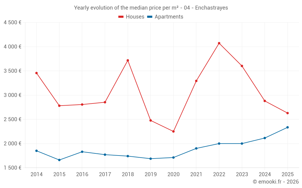 The median price on the 20 apartment transactions of the last 6 months in the municipality of Enchastrayes was 2 335 € per square meter for a median property value of 64 500 €. Over this period, 60% of transactions were between 1 911 and 2 900 € per square meter (from the 2nd to the 8th deciles).