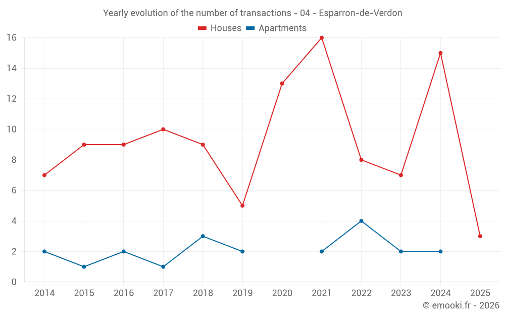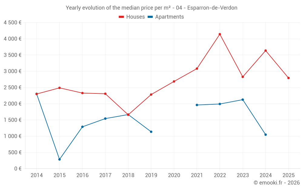 The median price on the 24 house transactions of the last 24 months in the municipality of Esparron-de-Verdon was 3 124 € per square meter for a median property value of 251 375 €. Over this period, 60% of transactions were between 1 660 and 4 579 € per square meter (from the 2nd to the 8th deciles).