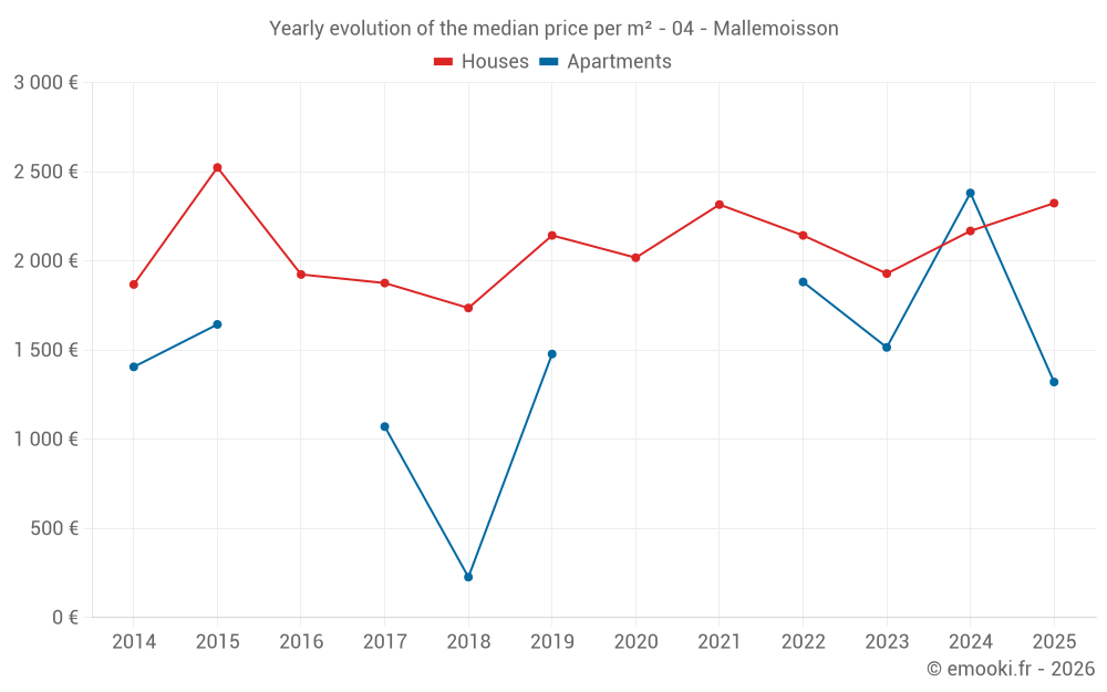 The median price on the 22 house transactions of the last 24 months in the municipality of Mallemoisson was 2 324 € per square meter for a median property value of 192 500 €. Over this period, 60% of transactions were between 1 439 and 2 709 € per square meter (from the 2nd to the 8th deciles).