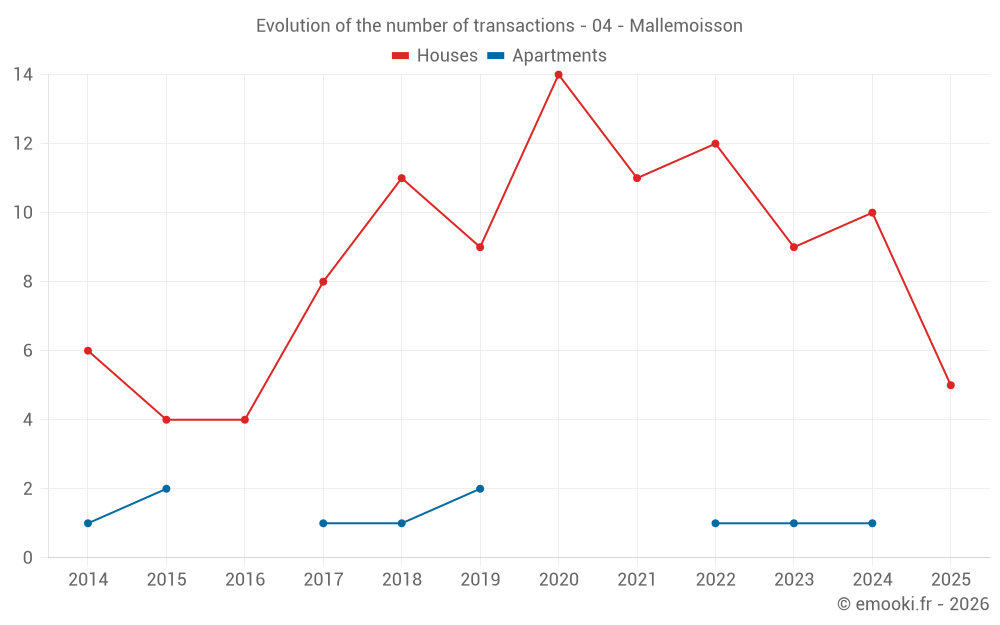 The median price on the 18 house transactions of the last 24 months in the municipality of Mallemoisson was 2 204 € per square meter for a median property value of 192 500 €. Over this period, 60% of transactions were between 1 537 and 2 916 € per square meter (from the 2nd to the 8th deciles).