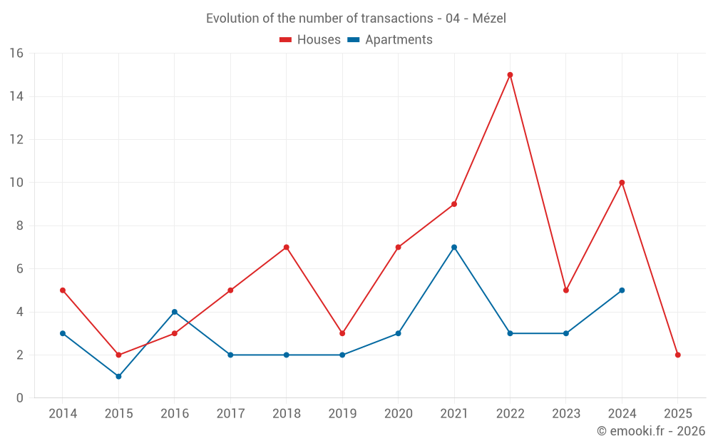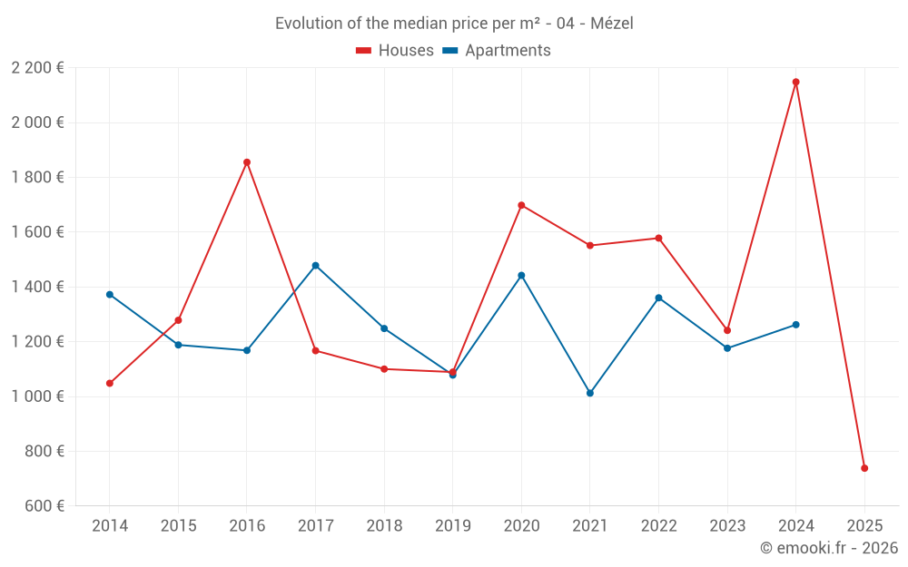 The median price on the 14 house transactions of the last 24 months in the municipality of Mézel was 1 730 € per square meter for a median property value of 107 500 €. Over this period, 60% of transactions were between 956 and 2 513 € per square meter (from the 2nd to the 8th deciles).