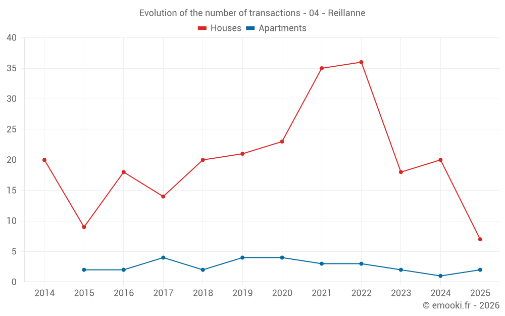 The median price on the 18 house transactions of the last 12 months in the municipality of Reillanne was 2 605 € per square meter for a median property value of 236 500 €. Over this period, 60% of transactions were between 2 182 and 3 571 € per square meter (from the 2nd to the 8th deciles).