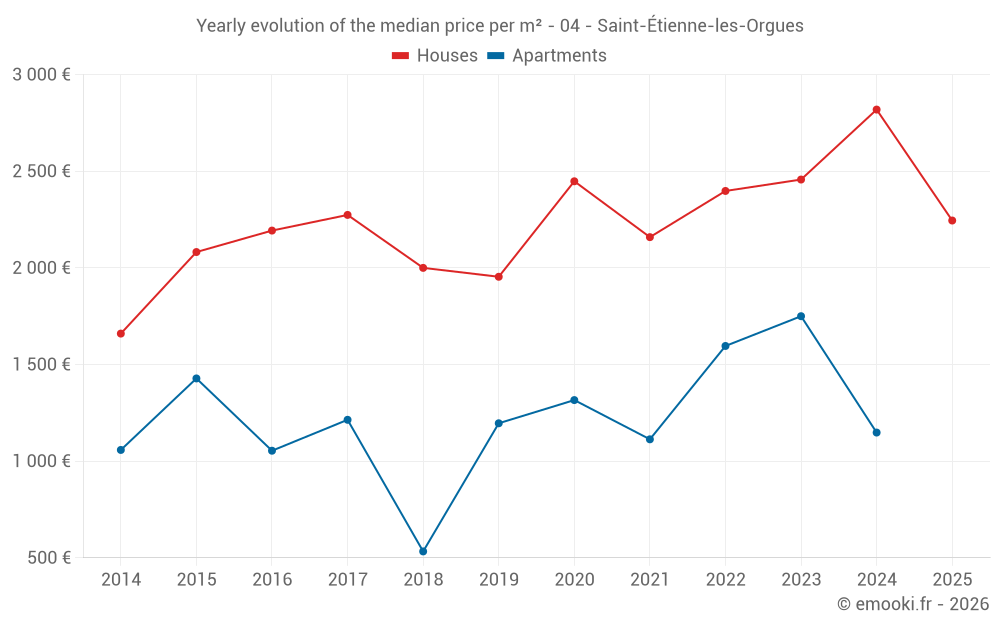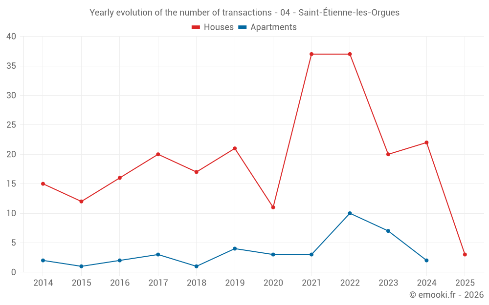The median price on the 34 house transactions of the last 24 months in the municipality of Saint-Étienne-les-Orgues was 2 514 € per square meter for a median property value of 213 925 €. Over this period, 60% of transactions were between 2 227 and 3 361 € per square meter (from the 2nd to the 8th deciles).
