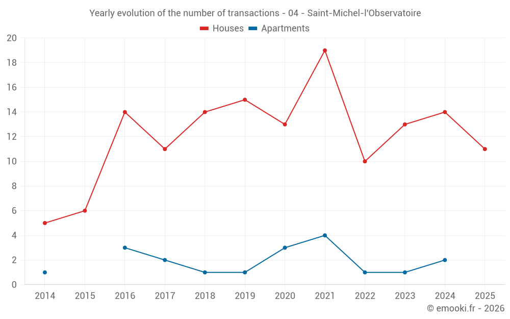 The median price on the 25 house transactions of the last 24 months in the municipality of Saint-Michel-l'Observatoire was 2 680 € per square meter for a median property value of 240 000 €. Over this period, 60% of transactions were between 1 870 and 3 178 € per square meter (from the 2nd to the 8th deciles).