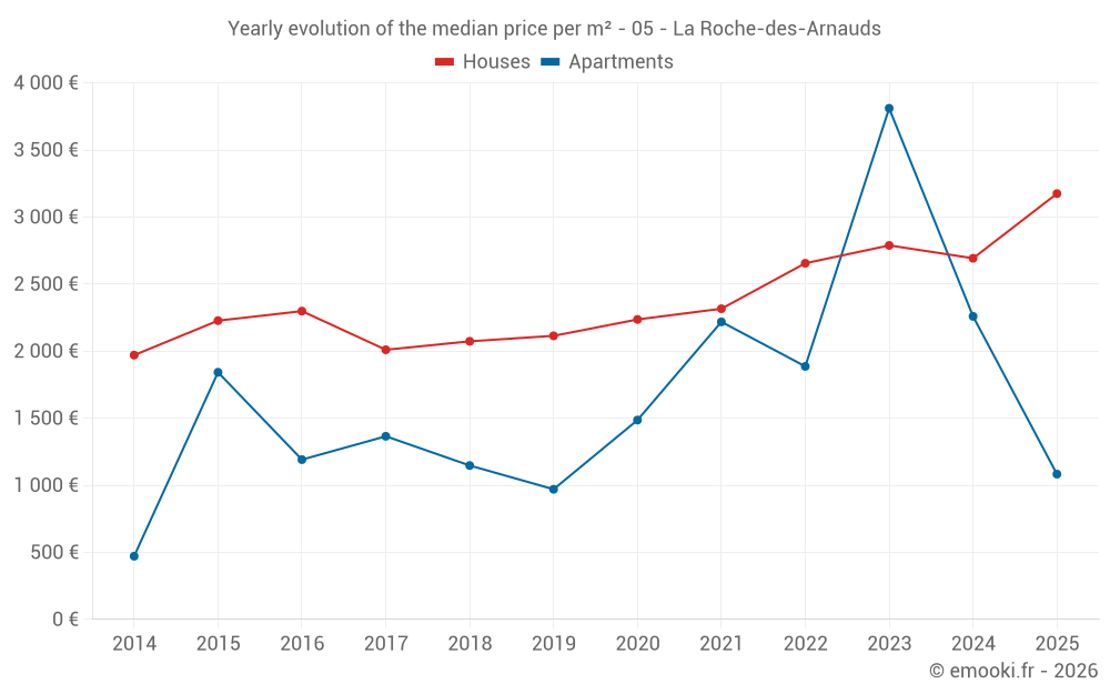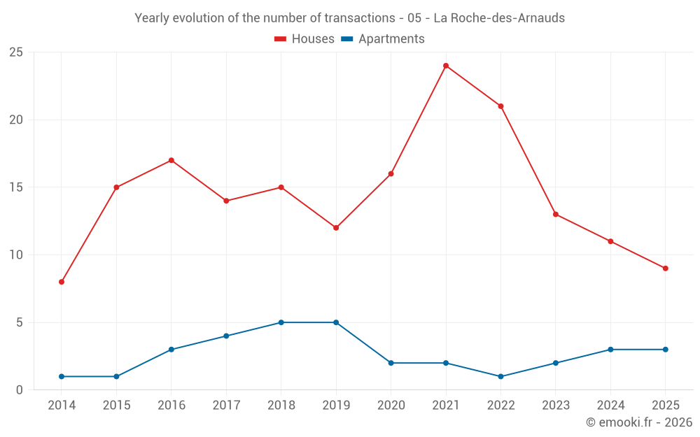The median price on the 17 house transactions of the last 12 months in the municipality of La Roche-des-Arnauds was 3 101 € per square meter for a median property value of 322 050 €. Over this period, 60% of transactions were between 2 577 and 3 773 € per square meter (from the 2nd to the 8th deciles).