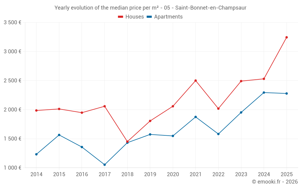 The median price on the 22 house transactions of the last 24 months in the municipality of Saint-Bonnet-en-Champsaur was 2 633 € per square meter for a median property value of 223 500 €. Over this period, 60% of transactions were between 1 926 and 3 566 € per square meter (from the 2nd to the 8th deciles).