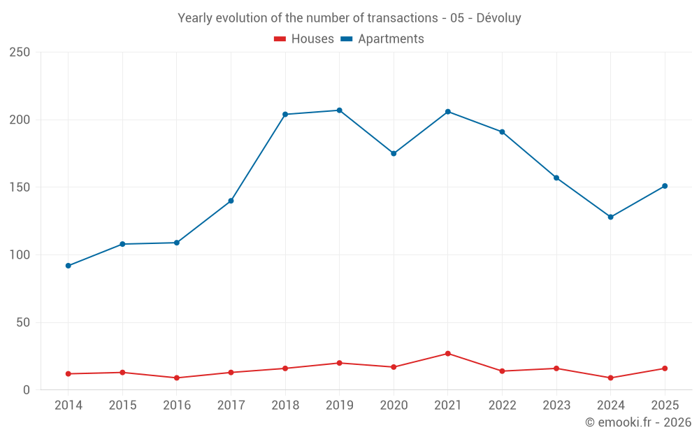 The median price on the 16 house transactions of the last 12 months in the municipality of Dévoluy was 4 352 € per square meter for a median property value of 277 500 €. Over this period, 60% of transactions were between 2 692 and 5 545 € per square meter (from the 2nd to the 8th deciles).