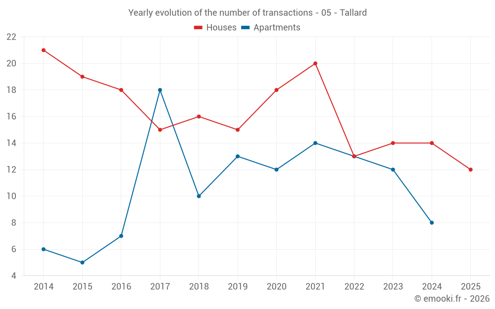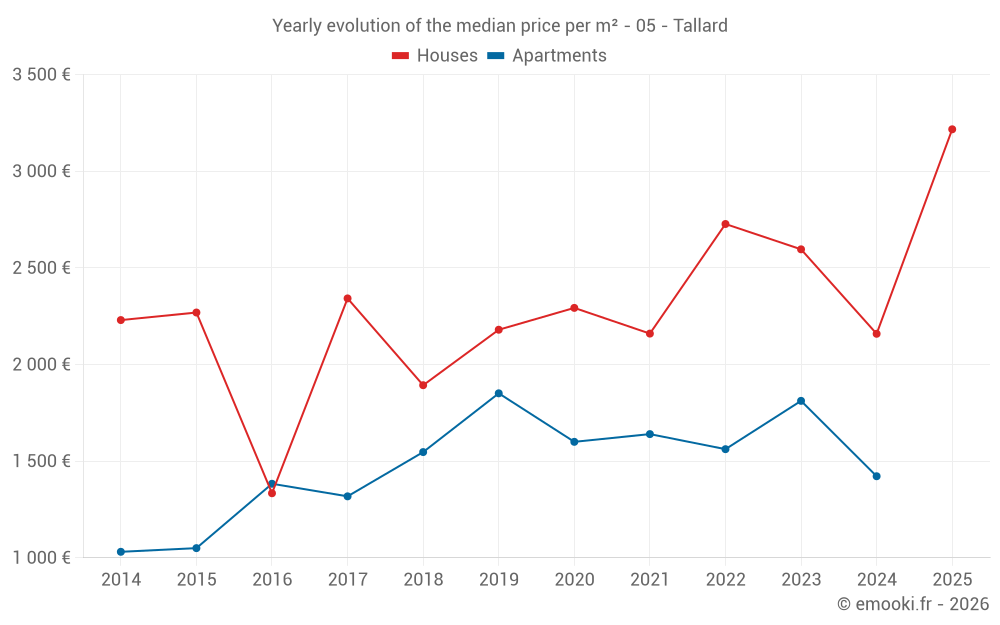 The median price on the 16 house transactions of the last 12 months in the municipality of Tallard was 2 906 € per square meter for a median property value of 199 750 €. Over this period, 60% of transactions were between 2 177 and 4 033 € per square meter (from the 2nd to the 8th deciles).