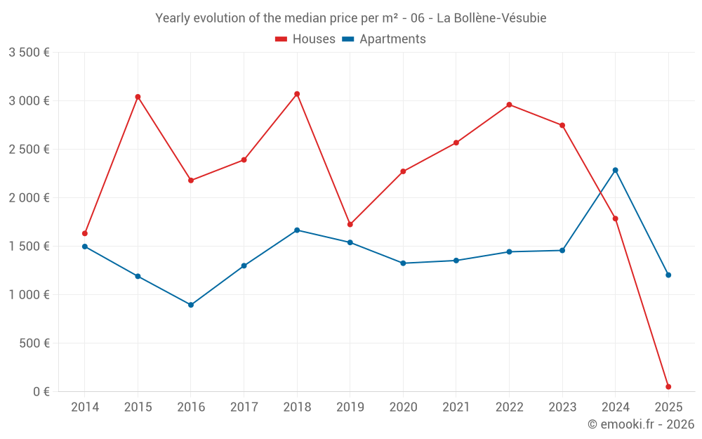 The median price on the 14 apartment transactions of the last 24 months in the municipality of La Bollène-Vésubie was 1 630 € per square meter for a median property value of 91 000 €. Over this period, 60% of transactions were between 1 208 and 2 393 € per square meter (from the 2nd to the 8th deciles).