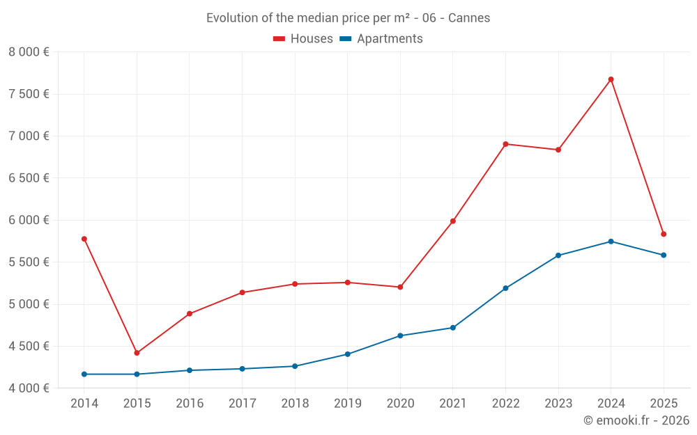 The median price on the 47 house transactions of the last 6 months in the municipality of Cannes was 5 833 € per square meter for a median property value of 653 500 €. Over this period, 60% of transactions were between 4 196 and 9 723 € per square meter (from the 2nd to the 8th deciles).