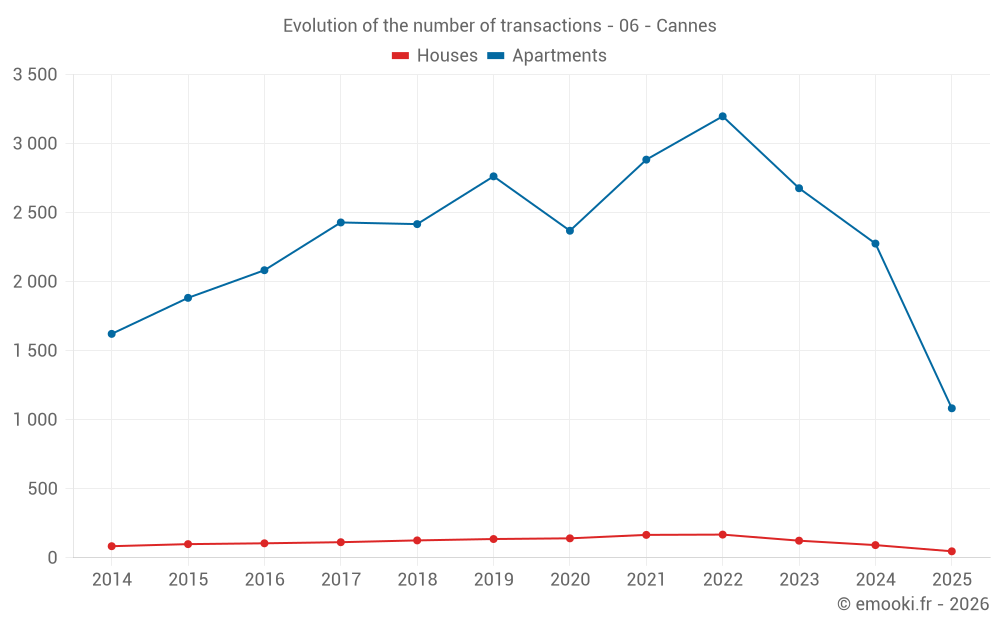 The median price on the 511 apartment transactions of the last 3 months in the municipality of Cannes was 5 627 € per square meter for a median property value of 260 000 €. Over this period, 60% of transactions were between 3 904 and 8 519 € per square meter (from the 2nd to the 8th deciles).