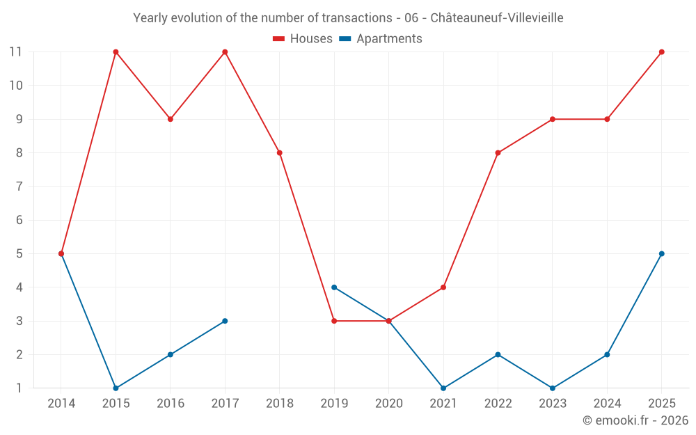 The median price on the 20 house transactions of the last 24 months in the municipality of Châteauneuf-Villevieille was 3 849 € per square meter for a median property value of 380 000 €. Over this period, 60% of transactions were between 2 573 and 4 586 € per square meter (from the 2nd to the 8th deciles).