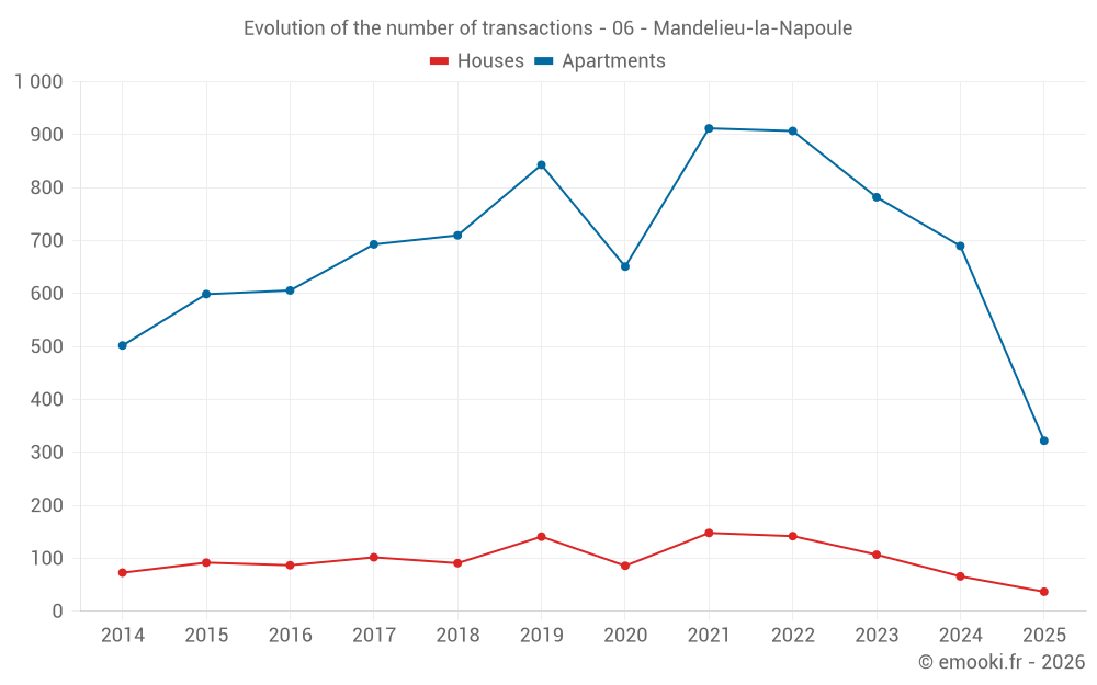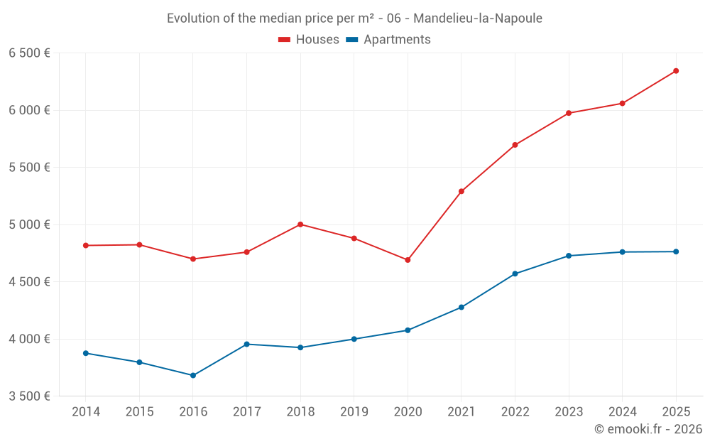 The median price on the 37 house transactions of the last 6 months in the municipality of Mandelieu-la-Napoule was 6 344 € per square meter for a median property value of 774 000 €. Over this period, 60% of transactions were between 3 860 and 7 377 € per square meter (from the 2nd to the 8th deciles).