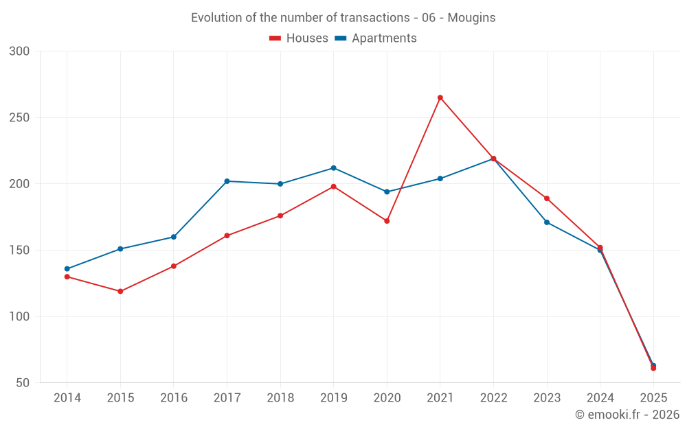 The median price on the 31 apartment transactions of the last 3 months in the municipality of Mougins was 4 853 € per square meter for a median property value of 199 900 €. Over this period, 60% of transactions were between 4 308 and 6 393 € per square meter (from the 2nd to the 8th deciles).
