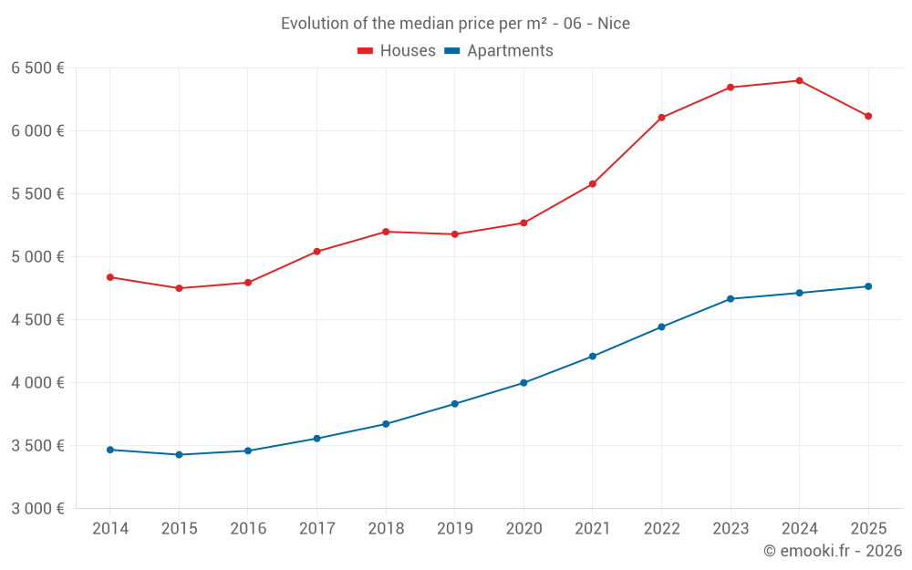 The median price on the 57 house transactions of the last 3 months in the municipality of Nice was 6 932 € per square meter for a median property value of 723 250 €. Over this period, 60% of transactions were between 4 119 and 11 574 € per square meter (from the 2nd to the 8th deciles).