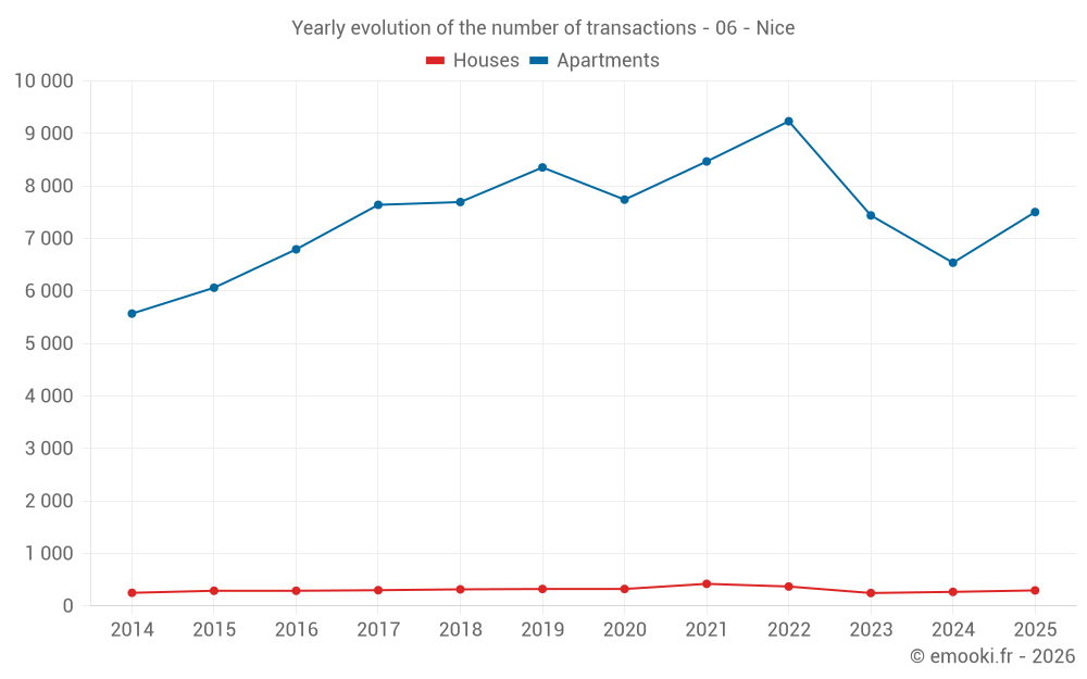 The median price on the 77 house transactions of the last 3 months in the municipality of Nice was 6 488 € per square meter for a median property value of 707 000 €. Over this period, 60% of transactions were between 4 288 and 9 536 € per square meter (from the 2nd to the 8th deciles).