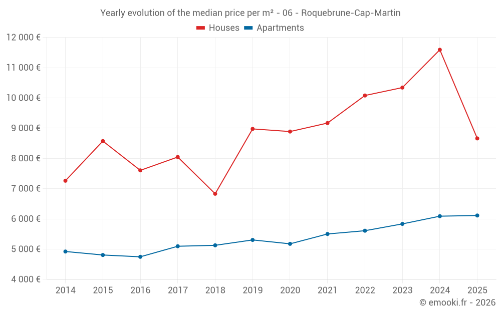 The median price on the 31 house transactions of the last 6 months in the municipality of Roquebrune-Cap-Martin was 8 659 € per square meter for a median property value of 1 550 000 €. Over this period, 60% of transactions were between 5 102 and 22 330 € per square meter (from the 2nd to the 8th deciles).