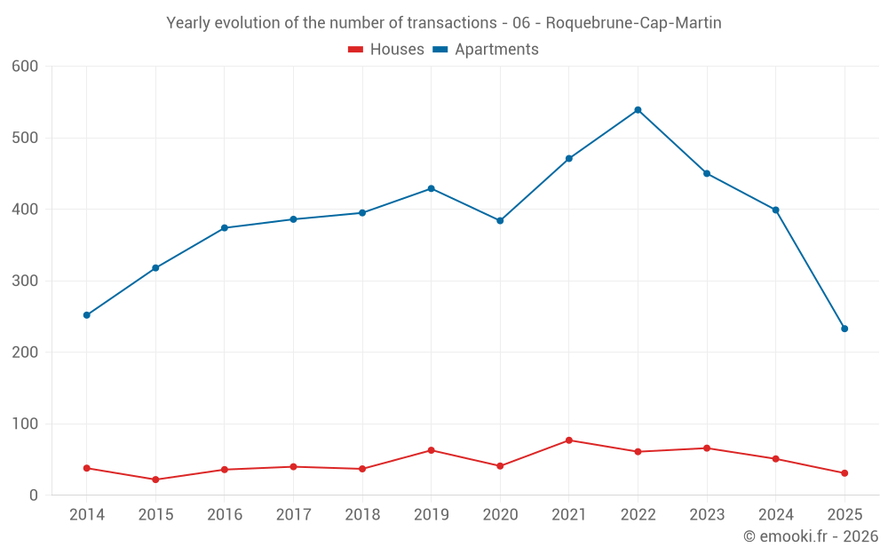 The median price on the 115 apartment transactions of the last 3 months in the municipality of Roquebrune-Cap-Martin was 6 111 € per square meter for a median property value of 280 000 €. Over this period, 60% of transactions were between 4 890 and 8 277 € per square meter (from the 2nd to the 8th deciles).