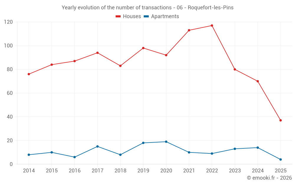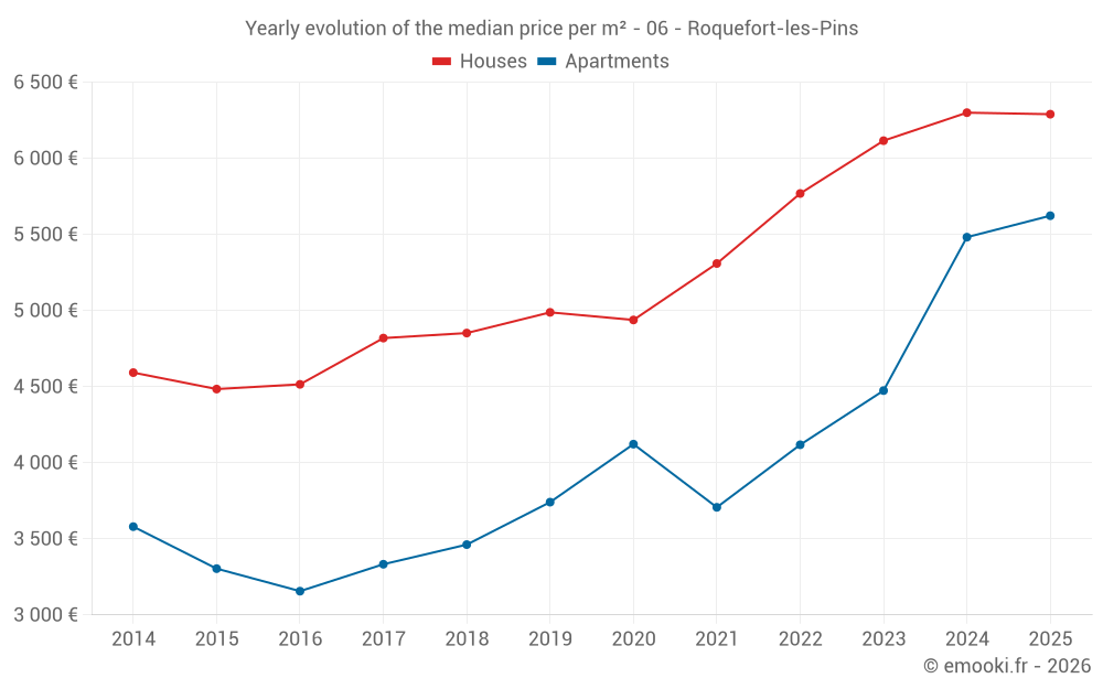The median price on the 37 house transactions of the last 6 months in the municipality of Roquefort-les-Pins was 6 290 € per square meter for a median property value of 750 000 €. Over this period, 60% of transactions were between 4 417 and 7 968 € per square meter (from the 2nd to the 8th deciles).