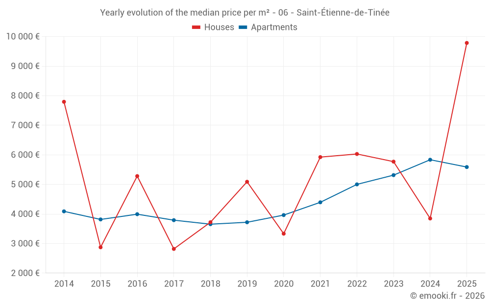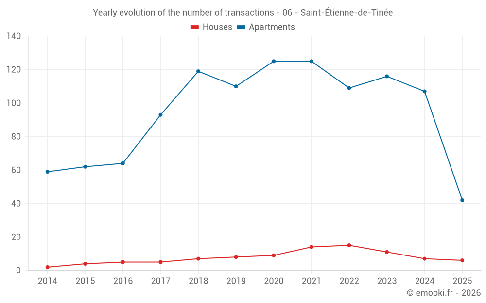 The median price on the 42 apartment transactions of the last 6 months in the municipality of Saint-Étienne-de-Tinée was 5 586 € per square meter for a median property value of 193 500 €. Over this period, 60% of transactions were between 3 865 and 7 348 € per square meter (from the 2nd to the 8th deciles).