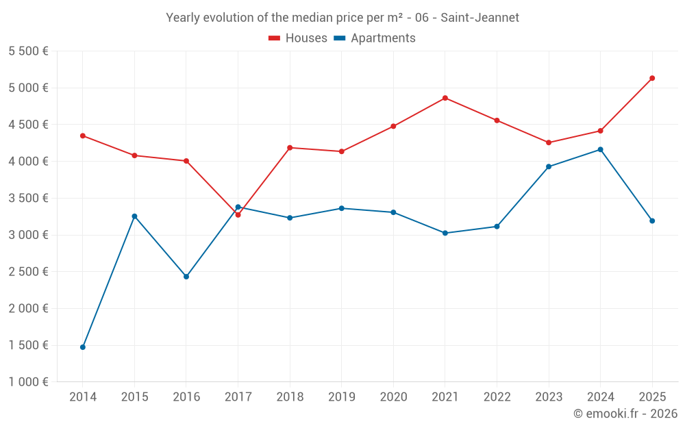 The median price on the 26 house transactions of the last 12 months in the municipality of Saint-Jeannet was 5 408 € per square meter for a median property value of 510 000 €. Over this period, 60% of transactions were between 3 971 and 6 400 € per square meter (from the 2nd to the 8th deciles).